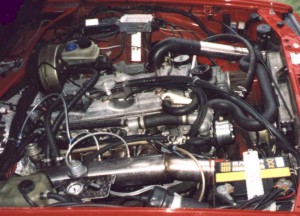 The enhance the power output, this 75 Turbo has an almost do-it-yourself installation. Ok, so it uses a fairly standart Garrett unit, but intake manifold and the intercooler (mounted directly in the bumper) are purpose-made. The air-flow sensor and the fuel pressure are optimised. For better cooling the water pump has a specially small pulley, increasing the rpm of the impeller. | ![]() |